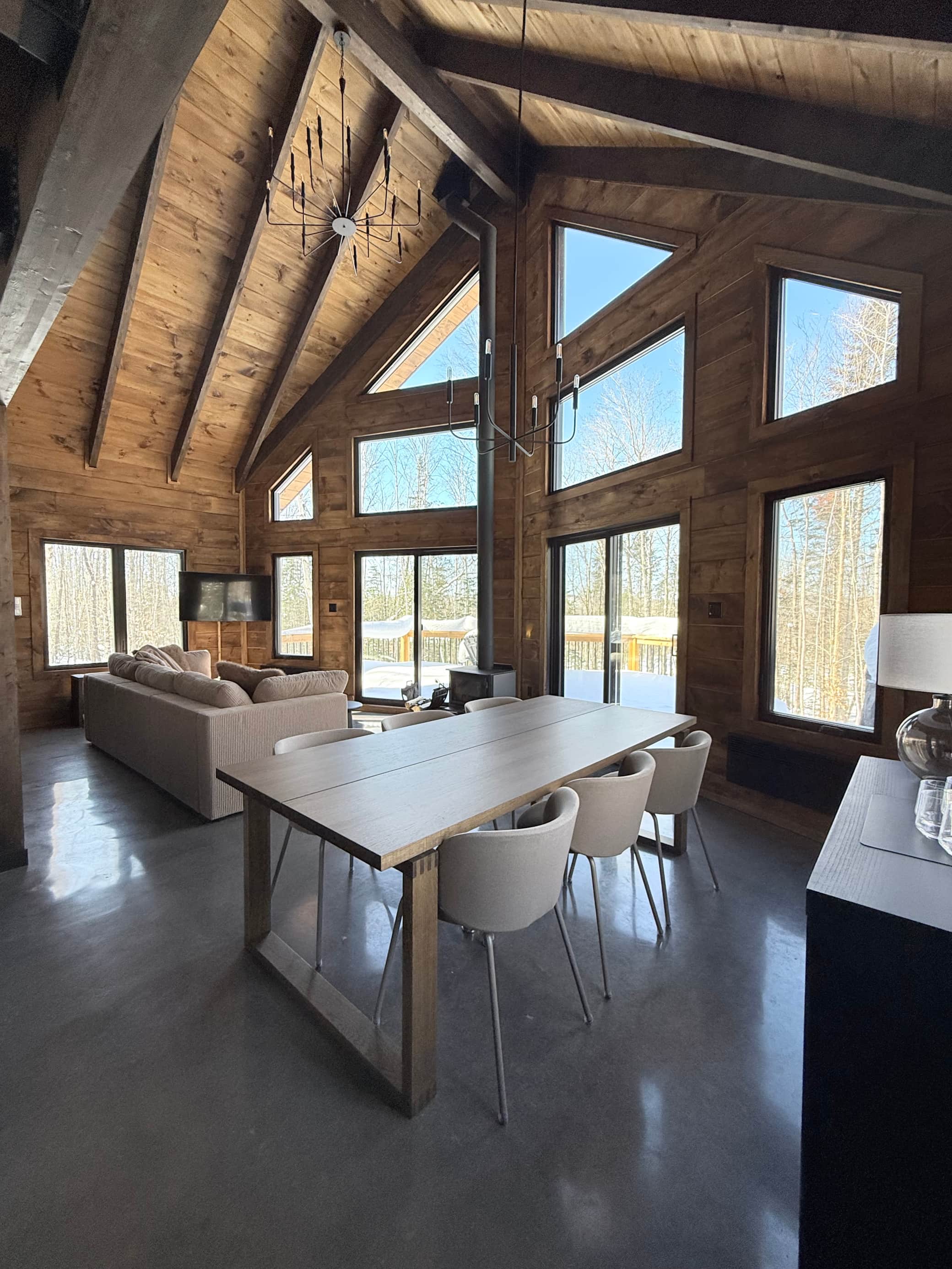 Ce chalet à aire ouverte, marie le charme du bois brut à l’élégance du desing contemporain: plafond cathédrale, grandes fenêtres offrant une vue imprenable sur la nature et un foyer invitant à la détente.